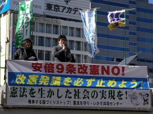 そんな寒さを蹴散らす様に次々と弁士が街宣車に乗り込み、昼休みの街行く人々に安倍政権が狙う憲法改悪について訴え掛けました。